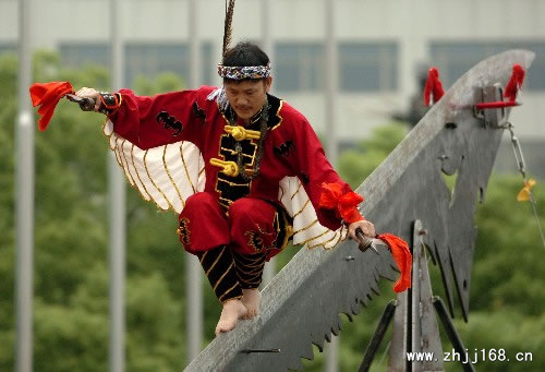 吉靖羽,是中国民间文化杰出传承人,著名民间表演艺术家,现任贵州民族绝技文化工作委员会主席等职。他一生切心研究苗技,博采众长,对中华民族绝技文化的定义、形式、内涵、外延和现状等,都作了深入的研究和阐述。他独创了《赤脚斜走大刀》、《枪尖舞蹈》等十多个尖端绝技节目。他的斜走大刀表演已达登峰造极之境,所到之处,掌声不绝,蜚声海内外。吉靖羽被世人誉为“刀锋上的奇人”、“世界大刀王”,并被录入《世界名人》。
