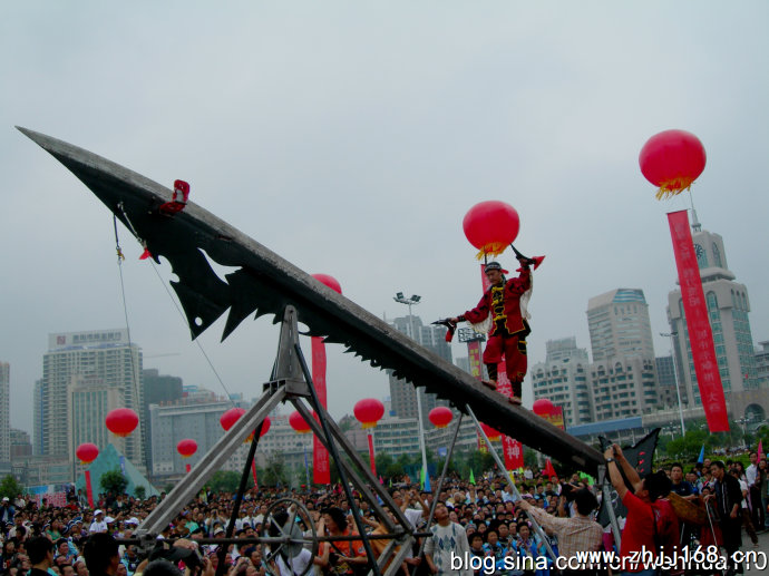 (央视4套播出的中国梵净山旅游文化节铜仁绝技世界大刀王吉靖羽赤脚斜走18米大刀表演,李玉刚、潘玮柏等明星助阵)